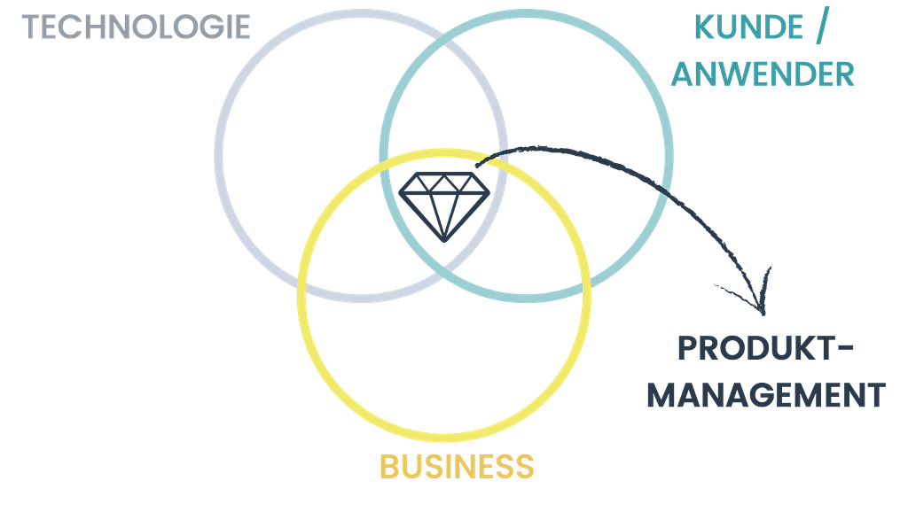Produktmanagement ist verantwortlich für den Produkterfolg und bringt dementsprechend die 3 Dimensionen Technologie, Kunden und Business Value zusammen.